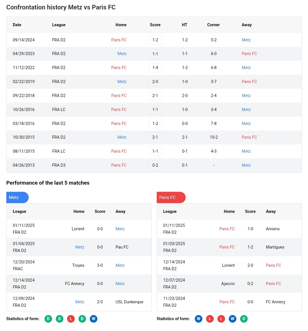 Head-to-Head (H2H) Results for Metz vs Paris FC